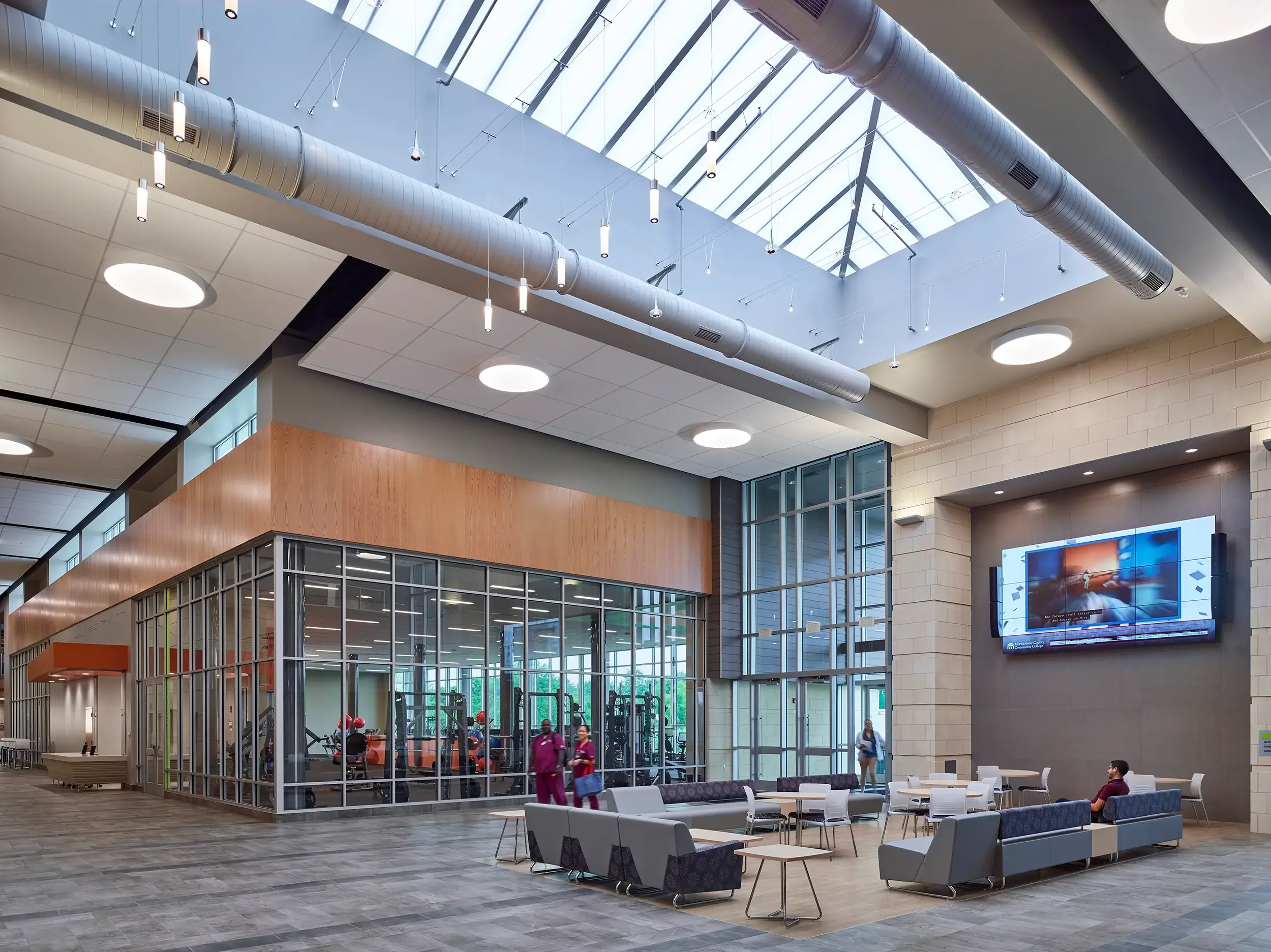 E.R. Stuebner was selected to renovate and construct additions to Montgomery County Community College’s Health Science Center. The center is home to the Health Sciences and Health/Fitness departments and their learning laboratories and clinics and is also the center for the College’s athletics and student fitness programs. Lab and Clinic spaces include Computer Labs, Seminar Rooms, Nursing and Medical Assisting labs with simulation spaces, exam beds, and control rooms. The building minimizes impact on the environment and includes green roofs, natural day-lighting, indoor trees and living walls, geothermal heating and cooling, energy efficient lighting, rain water harvesting, and a rooftop solar array.